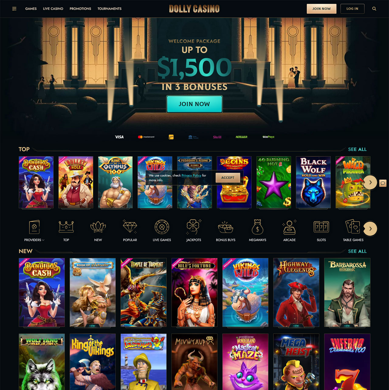 Dolly offers new players a generous 3 deposit $1500 welcome bonus, various banking options as well as the option of a wide choice of crypto and flat currencies to pick from - including popular choices like BitCoin, Tether, Ethereum, Dai and LiteCoin.